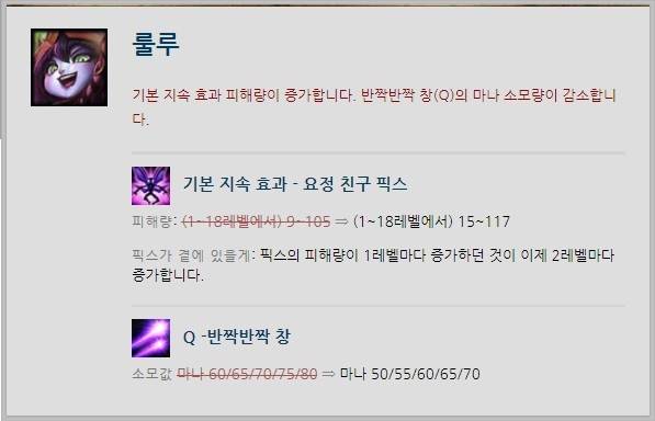 또한 룰루의 대표적인 공격 수단인 Q스킬 '반짝반짝 창'의 마나 소모값이 스킬 레벨 당 60/65/70/75/80->50/55/60/65/70으로 줄었다.