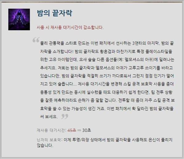아이템 '밤의 끝자락' 또한 상향된다. 밤의 끝자락의 재사용 대기 시간이 45초->30초로 감소한다. 또한 투명/위장 상태에서 밤의 끝자락을 사용해도 은신이 풀리지 않아 암살에 더욱 용이해질 것으로 보인다.