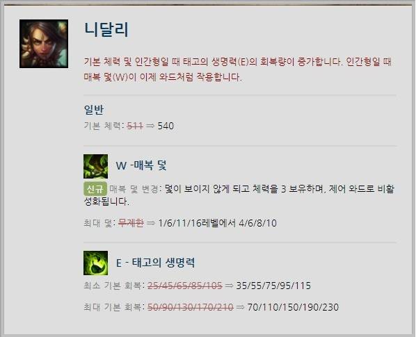 어느 순간 종적을 감춘 니달리가 소폭 상향됐다. 기본 체력이 511에서 540으로 증가했고, W스킬 '매복 덫'이 이름에 걸맞게 변경됐다. 매복 덫은 보이지 않으며 3의 체력을 보유한다. 또한 와드처럼 작용해 제어 와드로 비활성화 된다.