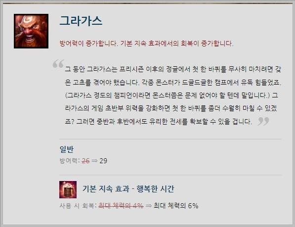 한 때 정글러로 각광받았던 그라가스는 초반 사냥에 고초를 겪으며 사용이 어려워졌다. 이에 라이엇 게임즈는 그라가스의 방어력을 25-29로 높여 초반 사냥에 힘을 실어줬다. 또한 기본 지속 효과 '행복한 시간'으로 회복량을 최대 체력의 4%->6%로 향상시켰다.
