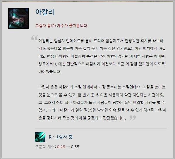 아칼리는 암살자 패치 이후에도 크게 빛을 발하지 못했다. 더욱이 7.2 패치에서 필수 아이템으로 여겨지는 '마법공학 총검'이 하향돼 상향의 필요성이 높아졌다. 이에 라이엇 게임즈는 아칼리의 궁극기 '그림자 춤'의 주문력 계수를 0.25->0.35로 향상시켰다.