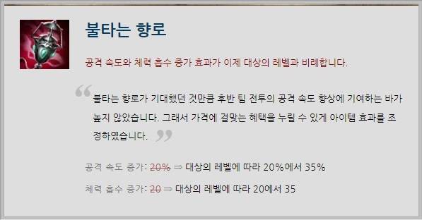 불타는 향로의 효용도 좋아졌다. 공격 속도를 고정적으로 20% 증가시켰던 효과가 대상의 레벨에 따라 20%~35%를 높여주도록 변경됐다. 체력 흡수 또한 20->대상의 레벨에 따라 20~35로 바뀌었다. 한편, 미카엘의 도가니는 마법 저항력이 35->40으로 향상됐다.