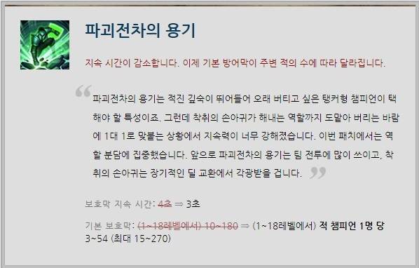 탱커류 챔피언들의 사랑을 받고 있는 특성 '파괴전차의 용기'가 하향됐다. 우선 보호막의 지속 시간이 4초->3초로 줄었다. 또한 1~18레벨에서 10~180을 얻을 수 있던 기본 보호막이 1~18 레벨에서 적 챔피언 한 명당 3~54를 얻도록 바뀌었다. 이에 라인전 단계에선 쓰임이 줄고, 대규모 교전에선 상황에 따라 위력이 증가할 것으로 보인다.