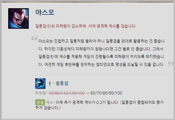 야스오의 초반 피해량이 줄어들 전망이다. 기동력을 갖춘 E스킬 '질풍검'의 피해량이 스킬 레벨 당 70/90/110/130/150->60/70/80/90/100으로 감소했다. 후반으로 갈수록 감소량이 증가하나 추가 공격력 계수 0.2를 부여해 균형을 맞췄다. 이에 게임 중후반 야스오의 위력을 건재할 것으로 보인다.