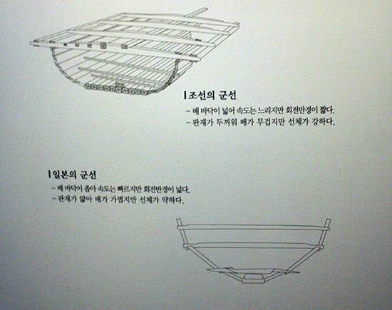 '조선과 일본 군선의 비교' 게시물이 조선 전함과 일본 전함의 장·단점을 간명하게 요약해준다. 조선의 군선은 배 바닥이 넓어 속도는 느리지만 회전 반경이 짧다. 판재가 두꺼워 배가 무겁지만 선체가 강하다. 반면, 일본의 군선은 배 바닥이 좁아 속도는 빠르지만 회전 반경이 넓다. 판재가 얇아 배가 가볍지만 선체가 약하다. ('아산 현충사 꼼꼼하게 둘러보기' 두 번째 기사는 곧 게재하겠습니다.)