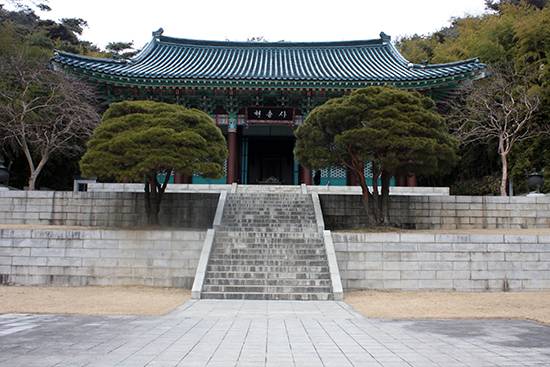 | ▲ 현충사 본전 현충사에서는 구사당(구본전), 신사당(본전), 옛집, 충무공이순신기념관을 꼭 둘러보아야 한다. 사진은 그 중 하나인 본전이다. |