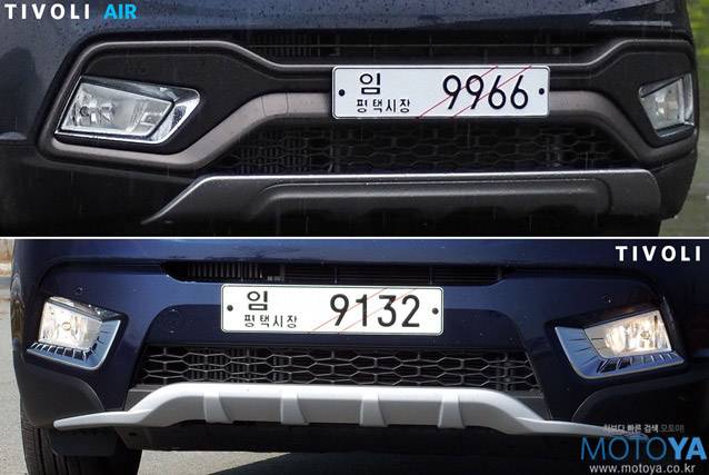 티볼리 에어의 첫 인상, 그 중에서도 얼굴은 오리지널에 해당하는 티볼리와는 분위기가 다르다. 헤드램프와 라디에이터 그릴은 똑같은데도 말이다. 이러한 차이를 느끼게 되는 이유는 헤드램프 아래에서부터 시작된다. 티볼리는 전반적으로 직선적인 아치형을 그리는 범퍼 디자인을 지니고 있지만, 티볼리 에어는 바벨의 형상을 이루는 디자인으로 빚어져 있다. 또한, 다수의 선을 정리하고, 바벨의 형상에 시선을 집중시켰다. 이 덕분에 티볼리 에어는 티볼리에 비해, 한층 깔끔하고 정돈된 얼굴을 갖는다. 바벨 타입 범퍼는 차체 외장 색상에 따라, 서로 다른 색상을 적용되어 더욱 독특한 분위기를 만들어낼 수도 있다.