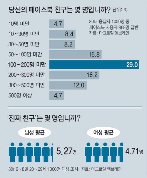 동아일보 2020행복원정대 취재팀이 여론조사기관 마크로밀 엠브레인과 20∼29세 청년 1000명을 대상으로 인간관계와 행복의 관계를 물었더니 대표적인 SNS인 페이스북 친구(페친)가 ‘100명 이상’이라고 답한 응답자가 약 62%를 차지했다. 하지만 ‘진짜 친구는 몇 명이나 되느냐’는 질문에 평균 4.99명이라고 답했다. 페친이 500명이 넘는다고 응답한 상위 그룹조차 진짜 친구는 평균 7.73명에 불과했다. 속마음을 툭 터놓을 수 있는 진짜 친구는 SNS 친구 수의 1.5%에 불과한 셈이다. 절반이 넘는 청년들(55%)은 인간관계 때문에 자주 또는 종종 어려움을 겪는다고 호소했다. 인간관계에 회의를 느끼고 피로감을 호소하는 ‘관태’(관계와 권태의 합성어)를 겪는 청년도 적지 않았다. 이번 조사에서도 ‘SNS 속 인간관계에 회의감을 느낀다’(41.4%)거나 ‘더는 온라인에선 친구를 늘리고 싶지 않다’(73.8%)는 답이 많았다. 비정규직으로 일하고 있는 이모 씨(28)가 이런 경우다. SNS 친구가 수백 명에 이를 정도로 ‘인맥 부자’였다. 하지만 온라인과 달리 현실에선 초라한 자신의 모습 때문에 남 앞에 서는 게 두렵다. 이 씨는 “관태를 느껴 친구들과 거리를 두며 ‘잠수’를 탔지만, 편하기는커녕 오히려 우울감만 커졌다”고 말했다. 최근 혼행(여행) 혼밥(식사) 혼강(수강) 등 홀로 일상을 처리하는 ‘혼족’ 열풍도 SNS의 화려한 관계 이면의 현실에서 고독을 느끼는 젊은이들의 관태와 관련이 있다. 이 같은 ‘관계 기피’ 현상이 신조어를 만들어내기도 한다. 이성을 만나는 것이 불편해 동성끼리 시간을 보내는 ‘게이트’(게이+데이트), 온라인에서조차 피곤한 관계에 엮이기 싫어 흔적을 지우는 ‘글펑족’(익명으로 게시했다가 삭제하는 사람), 신상이 드러나지 않는 제2의 계정을 뜻하는 ‘세컨드 계정’ 등이 대표적이다. 김문조 고려대 명예교수(사회학)는 “관계는 행복한 삶을 위해 고려해야 할 상수(常數)”라며 “관태는 힘들고 허무한 인간관계에 대한 회피에 가깝다”고 설명했다. ○ ‘카·페·인’ 속 인맥 경쟁의 그늘