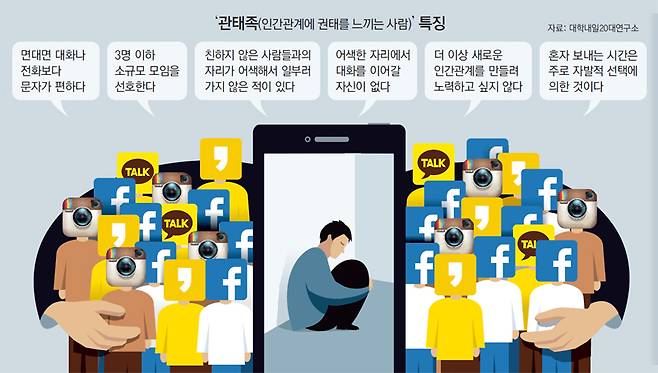 “학교 많이 안 가요. 점심은 그냥 ‘인간사료(건빵)’로 때워요.” 이번 학기부터 ‘자발적 아싸(아웃사이더)’가 되기로 한 대학생 김명민(가명·25) 씨는 1주일에 잘해야 한두 번 학교에 간다. 주로 집에 머물며 식사도 건빵 등으로 때운다. 그의 소셜네트워크서비스(SNS)에 연결된 학교 친구는 150여 명이 되지만 언제든 편히 불러낼 만한 친구는 한 명도 없다. 개강 파티에도 가보고, 인맥관리 책도 읽어봤지만 인간관계에 영 자신이 없다. 매년 찾아오는 ‘개강 울렁증’이 싫어 김 씨는 스스로를 집 안에 가두고 고립되는 삶을 택했다. 김 씨만의 고민일까. ‘관계 고민’은 다양한 양상으로 청년들의 삶에 침투해 행복을 무너뜨린다. SNS로 수백 명과 순식간에 친구로 연결될 수 있는 세상이지만, 청년들은 그런 양적 관계의 팽창에 피로감을 호소하고 있다. 인간관계의 권태기(倦怠期), 청년들은 이를 ‘관태기’라고 부른다. ○ ‘페친’은 100명 이상, 진짜 친구는 4.99명