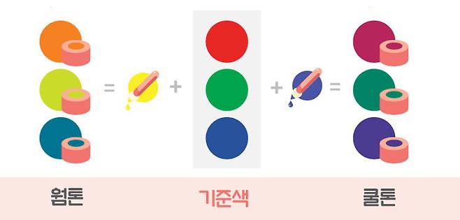 보통 우리가 미술 시간에 배우는 따뜻한 난색(暖色)과 차가운 한색(寒色)의 개념이 아닙니다.