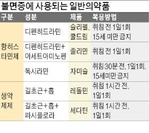 국내에서 불면증으로 허가받은 일반의약품은 1세대 항히스타민제, 길초근 성분이 들어간 복합제가 있습니다. 이런 약은 단기적 불면증에 사용하고 3주 이상 지속되면 진료받아야 합니다. 중추신경 억제 작용이 있는 약물과 술은 이상 반응을 유발할 수 있어 함께 복용해선 안 됩니다.