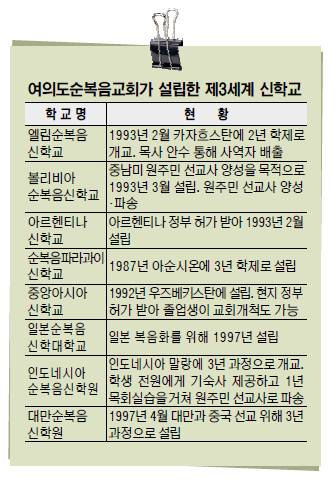 선교지가 확대되면서 더 많은 선교사가 필요했다. 교회는 94년 1월 순복음세계선교학교를 설립하고 언어 훈련을 비롯해 선교지 문화와 선교학을 집중 강의했다. 현지인 사역자 양성을 위해 주요 선교지에 신학교를 세웠다(표 참조). 새로운 전략을 안착시키기 위해 조 목사는 아프리카를 시작으로 러시아와 동유럽, 인도, 동남아와 남미 대성회를 이어가며 전도와 치유 사역을 확대해 나갔다.