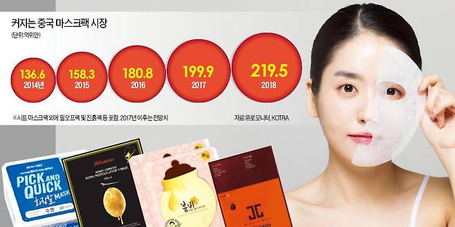 시장조사기관 닐슨에 따르면 중국 마스크팩 시장은 2014~2016년 연평균 24.6% 성장했다. 시장 규모는 2016년 181억위안(약 3조700억원)에서 지난해 200억위안(약 3조4000억원)가량으로 커졌다.