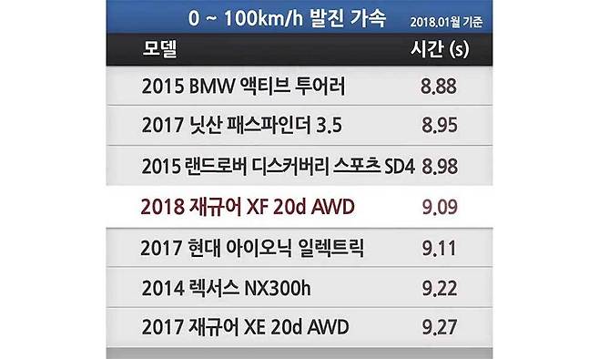 단, 무게감에서 불리한 모습이 엿보였다. 늘씬한 몸매를 갖는 XF. 디자인처럼 실제 몸무게도 조금 더 가벼워지면 좋겠다. 테스트 모델인 XF 20d AWD 모델의 공차중량은 1,870kg 수준이었다. 4기통 2.0리터 디젤엔진과 4륜 시스템을 갖춘 동급 경쟁 모델의 공차중량을 기준으로 보자. 벤츠 E220d 4MATIC 1,825kg, BMW 520d xDrive 1,770kg의 무게를 보여줬다. XF는 이보다 45~100kg까지 무거운 모습이었다.