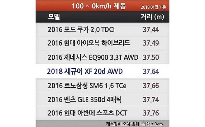 시속 100km에서 완전히 정지하는데 이동한 최단 거리는 37.64m였다. 테스트를 반복한 결과 제동거리는 38m 대를 유지했다. 당시 기온이 영하 15도에 이를 정도로 맹추위가 기승을 부렸기에 제동 시스템의 냉각에 도움이 되었을 것이다. 제동 내구성 부분은 추후 확인이 필요할 수 있겠다.
