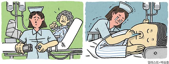 2015년 '메르스 사태' 이후 병원 내 감염을 막고 보호자의 간병 부담을 해소하기 위해 '간호·간병 통합 서비스'가 본격 도입됐다. 간호사가 간병인 역할까지 하는 것이다. 보호자가 환자 옆에서 쪽잠을 자며 돌보는 '한국식 간병 문화'를 없애겠다는 취지다. 이 서비스가 시작된 후 간호사들이 극심한 스트레스를 호소하고 있다. 환자들의 과도한 요구에 시달리다 보니 정작 중요한 치료는 제대로 못 할 지경이라는 것이다.
