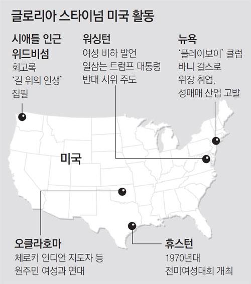 ‘미투 운동’과 ‘타임스 업’(Time’s up) 등 여성운동의 구심점이 된 글로리아의 내공은 길에서 축적됐다. 미국 시애틀 인근 위드비섬에 있는 여성 작가를 위한 공간에서 집필한 회고록 ‘길 위의 인생’ 서문에는 영국 산부인과 의사가 등장한다.