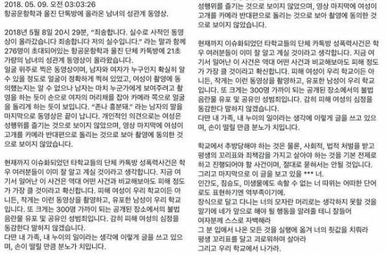 문제를 제기한 글쓴이는 “영상 속 여성의 경우 소속을 알 수 없지만 남성은 재학생이다. 어느 학교 출신이든 성관계 과정이 촬영돼 유포된 것은 성범죄”라며 “법적 처벌을 받고 죄책감을 갖고 살아야 한다. 여성에게 자백하고 모든 것을 실행에 옮겨 죗값을 치러야 한다”고 목소리를 높였다.