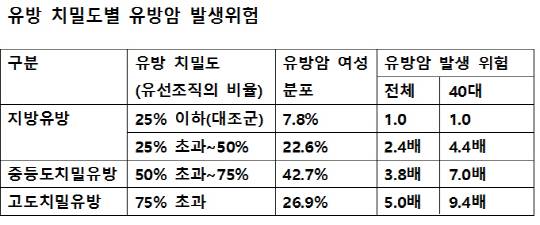유방의 실질량(젖을 만들어내는 유선조직의 양)이 75%를 넘는 고도치밀유방을 가진 우리나라 여성은 실질량이 25% 이하인 지방유방 여성에 비해 유방암 발생위험이 5배나 높은 것으로 나타났다.