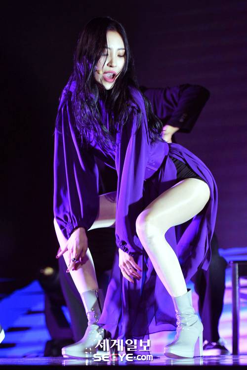 신곡 ‘주인공’의 무대를 위해 보라색 의상을 선택한 선미는 품이 넉넉한 퍼프소매와 셔링 디테일의 상의 디자인에도 가려지지 않는 가녀린 몸매를 과시했다. 이와 함께 스커트 부분의 시스루 디테일로 날씬한 각선미를 은근히 노출해 남성 팬들의 이목을 집중시켰다.