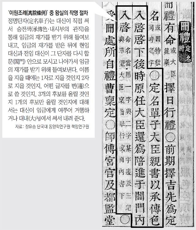 조선시대 국왕의 작명 과정은 조선왕조실록과 승정원일기에 기록돼 있다. 왕자가 태어나면 신하들이 이름 후보 세 가지를 담아 정명단자(定名單子)라는 것을 올리고 왕이 낙점했다. 중국 황제나 선대 임금의 이름과 겹치지 않는지, 역사 속 악인과 겹치지 않는지, 음과 뜻이 좋은지 등을 고려했다. 일례로 헌종의 정명단자에는 후보로 환(s), 희(熙), 광(炚) 등 3글자가 올라왔는데, 음과 더불어 ‘밝게 비추다’(明照) 등의 뜻만 쓰여 있다.