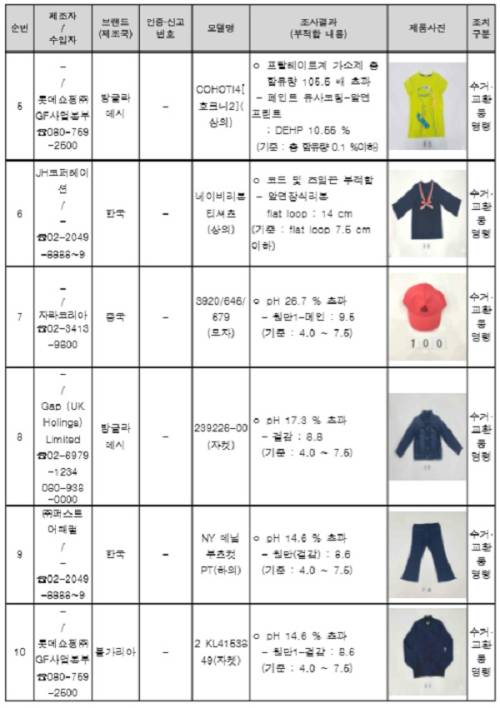유니클로 ’울트라스트레치데님이지팬츠(데미지 하의)‘, 갭 일부 모자와 재킷, 자라코리아 일부 모자와 양말은 산성도가 기준치를 초과했다.