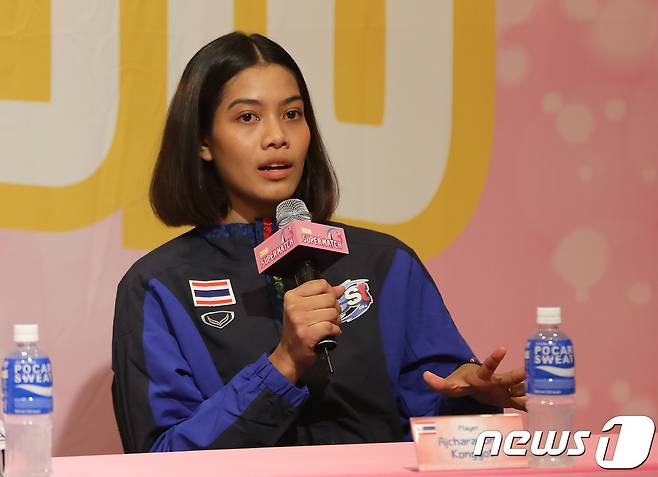 (화성=뉴스1) 오장환 기자 = 아차라폰 콩욧 태국 여자배구 올스타 선수가 6일 오후 경기도 화성시 안녕동 호텔 푸르미르에서 열린 2018 한국-태국 여자배구 올스타 슈퍼매치 기자회견에서 취재진 질문에 답변하고 있다.