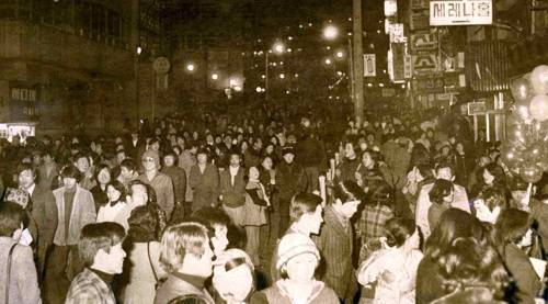 서울 명동입니다. 요즘처럼 시민들이 거리를 가득 메우고 있습니다. 통금 해제 후의 모습은 아니고 1974년 12월 25일 크리스마스를 맞아 일시적으로 해제한 모습입니다. 통금 해제에 대한 욕구를 보여주는 사진입니다.