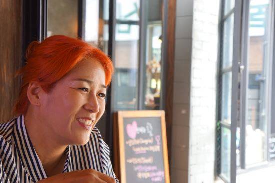 머리는 빨간색으로 염색을 했고 표정은 웃음을 지우지 않는다.