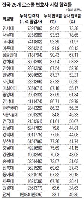 법조계는 이번 로스쿨별 합격률 공개를 계기로 하위권 로스쿨을 중심으로 한 통폐합 논의가 거세질 것으로 보고 있다. 대한변협은 이날 성명을 내고 "공개된 합격률을 보면 로스쿨 간 학력 수준 차이가 매우 크다"며 "전국적으로 난립해 있는 25개 로스쿨을 통폐합해 균등한 교육 제공 방안을 강구해야 한다"고 했다.