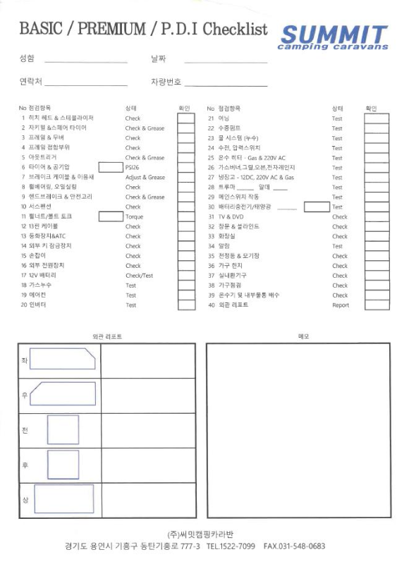 영국 LUNAR 카라반으로 더 잘 알려져 있는 (주)써밋캠핑카라반 정비동을 찾아 ‘써밋 케어 서비스’에 대한 이야기를 차진환 대표를 통해 직접 들을 수 있었다. ‘써밋 케어 서비스’는 BASIC SERVICE 18개 항목, PREMIUM SERVICE 40개 항목으로 구분할 수 있다. 2년 워런티 적용으로 해당 브랜드의 출고 고객은 무상점검 서비스에 해당되지만 개별 점검 시에는 BASIC 20만 원, 외부와 전기 장치를 포함한 40개 항목 점검에 40만원의 비용이 든다. 단순히 절차상의 점검이 아니라 점검을 받은 카라반은 이상이 없다는 해당 서비스 년도의 인증 스티커를 부착하므로 중고 거래 시 판매자와 구매자 모두의 고민을 해결할 수 있다.
