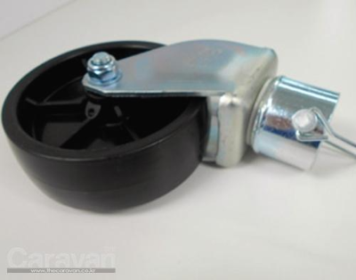 자키휠(Jockey wheel), 미국 트레일러에서는 텅잭이라 불리는데 카라반의 이동에 있어 가장 중요한 방향타의 역할을 수행한다. 작지만 이동을 위한 필수 부품이며 고정이 되지 않을 경우 커플러 손상을 가져올 수 있다. 과속 방지턱이나 주행 중 파손이 되는 부위이다.