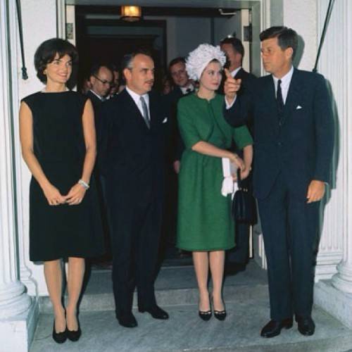 1961년 5월 워싱턴 백악관을 방문한 모나코 레이니에 3세와 그레이스 켈리 부부. 켈리는 모나코 왕비의 신분으로 고향인 미국 땅을 밟았다. 당시 양대 패션 아이콘으로 불린 재클린 케네디와 모나코 왕비 켈리의 만남으로 더욱 화제가 됐다. 하이네크의 검정 드레스에 진주목걸이로 포인트를 준 재클린. 이에 켈리는 밝은 초록색 지방시 드레스에 프린지가 달린 볼레로를 매칭했다.
