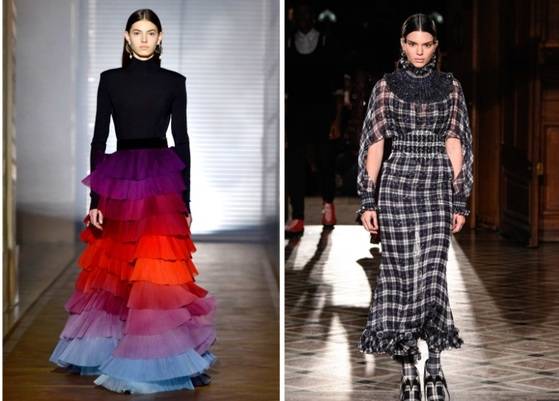 지난 1월23일 파리 오트쿠튀르 패션위크에서 지방시 무대에 선 모델. 오른쪽은 지난해 1월 파리에서 지방시 쇼 런웨이를 걷고 있는 모델 켄달 제너.