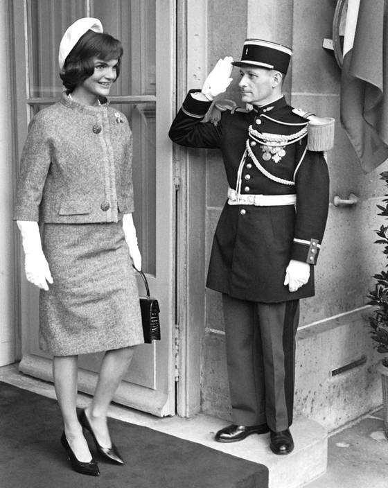 1961년 6월, 파리를 방문한 미국 퍼스트레이디 재클린 케네디가 지방시 투피스를 입고 파리의 프랑스 외무성 건물을 나서고 있다. 재클린 케네디는 케네디 대통령의 장례식 때 입을 장례복을 지방시에 주문 제작해 입었다. 장례일정에 맞추기 위해 지방시가 밤샘작업으로 드레스를 완성했다는 건 유명한 일화다. 재키의 검정 드레스는 오드리 헵번의 영화만큼이나 지방시를 홍보하는 계기가 됐다.