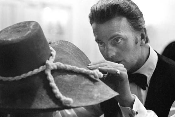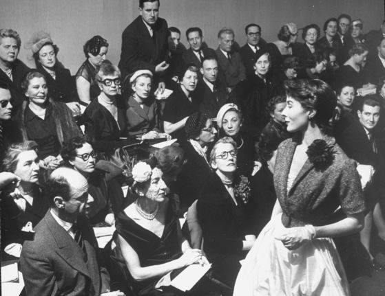 1950년 무렵, 무대에 오를 모델의 모자 챙을 바로잡고 있는 지방시.