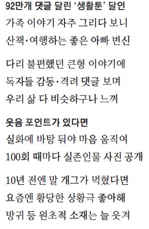 ▷진짜로 생활툰 덕분에 변했다. '생활의 참견'에 가족 에피소드가 많이 나온다. 독자들은 '좋은 아빠, 자상한 남편'이라고 생각하지만 작품을 하면서 변한 거다. 에피소드를 만들기 위해서라도 가족이랑 추억을 많이 쌓았다. 산책을 하거나 여행을 하는 등 이 작품 덕분에 가족에게 집중할 수 있게 됐다. 이 작품이 내가 철이 들게 한 은인이다. 사실 나는 실수도 많고, 술 마시고 밤늦게 들어오기도 하는 평범한 남자다. 하지만 이 작품 덕에 '자상한 남편의 아이콘'이 돼버려서 조금 부담스럽다.
