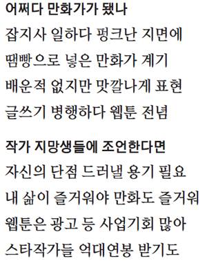 ―잡지사 기자를 하다가 웹툰 작가가 됐다. 회사원 중에도 작가를 꿈꾸는 사람이 많다. 이들에게 조언을 해준다면.