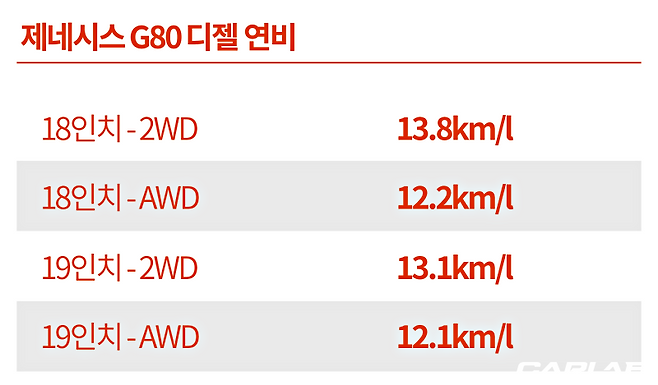 복합연비는 후륜구동-18인치 타이어 기준으로 13.8km/l이며, 사륜구동- 18인치 타이어의 연비는 12.2km/l다. 19인치 타이어의 경우, 후륜구동이 13.1km/l, 사륜구동이 12.1km/l이다.