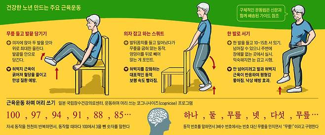 엉덩이와 다리 근육은 전체 근육의 70%를 차지하며 노년기 삶을 지탱하는 힘이다. 이 때문에 근육이 연금보다 강하다는 말이 나온다. 하지만 나이 들면 근육운동을 해도 근력이 늘지 않는다는 잘못된 생각 때문에 근력 운동에 나서는 고령자가 드물다. 도쿄 건강장수의료센터 김헌경(근육학 박사) 연구부장은 "집에서 쉽게 할 수 있는 근육운동을 매일 10분만 꾸준히 해도 일년 정도 지나면 현재 근력의 20%까지 늘릴 수 있다"며 "그렇게 되면 노년 건강 최대 복병인 낙상 사고가 줄고, 사회 참여 활동은 늘어나 우울증도 예방된다"고 말했다. 인생 후반의 낙천적 생활은 근육에서 나온다는 의미다. 김헌경 연구부장은 도쿄 건강장수의료센터가 만든 근육운동 프로그램을 총괄 제작했다. 조선일보가 배포한 근육운동 가이드도 이를 바탕으로 했다.