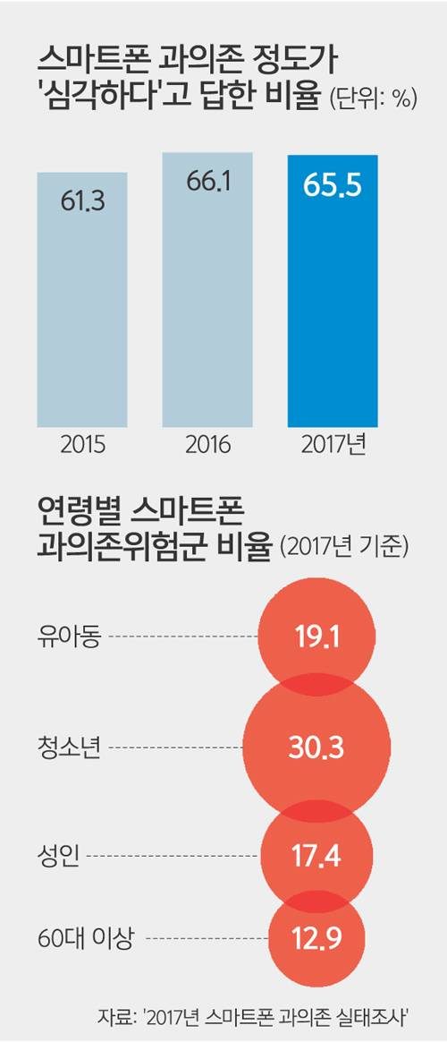 한국의 청소년 스마트폰 중독도 미국 못지않다. 과학기술정보통신부와 한국정보화진흥원(NIA)이 지난 2월 발표한 ‘2017년 스마트폰 과의존 실태조사’를 보면 지난해 10∼19세 청소년의 스마트폰 ‘과의존위험군’ 비율은 30.3%에 달한다. 이를 세분화하면 ‘잠재적위험군’이 26.7%였고, 의존도가 아주 높은 ‘고위험군’은 3.6%였다. 10대 청소년 10명 중 3명꼴로 스마트폰 중독이 심각하다는 얘기다. 과의존위험군 중에서 고위험군 비율은 중학생이 3.9%로 고등학생(3.4%)을 앞섰다. 그나마 청소년 중 위험군 비율은 2015년 31.6%로 사상 최고였다가 2016년 30.6%, 지난해 30.3%로 조금씩이나마 줄어드는 추세다.