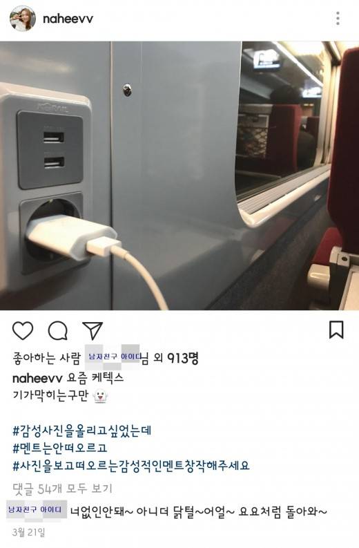 지난 3월 21일에는 “요즘 KTX. 기가 막히는구만”이라는 김나희의 글에, “너 없인 안 돼. 요요처럼 돌아와”라고 남자친구의 바람이 적혀 있다. 잠시도 떨어지기 힘든 커플의 달달함이 그대로 전해진다.