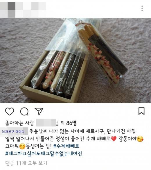 2017년 11월 12일에는 “추운 날씨, 내가 없는 사이 재료 사고, 만나기 전 아침 일찍 일어나서 만들어준 정성이 들어간 수제 빼빼로. 감동이야, 고마워. 동생 것은 덤. 태그하고 싶어도 태그할 수 없는 내 여친”이라는 애정 어린 글과 함께 빼빼로 사진을 올렸다. 연예인인 여자친구를 태그할 수 없다는 안타까움이 묻어나온다.