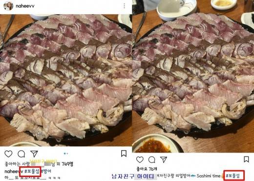 그리고 하루 지난 2월 12일 김나희의 남자친구 역시 “여자친구랑 리얼 방어, 보물섬”이라는 글을 올렸다. 방어회를 비롯해 주변에 놓인 식기가 김나희가 올린 것과, 오차 없이 동일했다.
