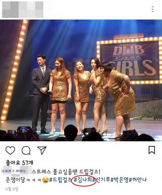 김나희가 뮤지컬 ‘드립걸즈7’ 공연을 시작하고부터는, 남자친구의 홍보에도 열이 올랐다. 김나희의 남자친구는 “스트레스 풀고 싶을 땐 드립걸즈”라는 말과 함께, 드디어 김나희를 태그했다.