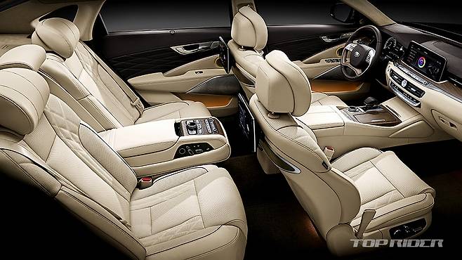 시트의 안락함은 THE K9에서 가장 뛰어난 부분 중 하나다. 나파가죽 소재의 고급감이 뛰어날 뿐만 아니라 시트의 쿠셔닝이 기존 제네시스와도 구분된다. 퀼팅 패턴은 시트 뿐만 아니라 1, 2열의 도어 트림부에도 적용되며, 쿠션감까지 적용했다.