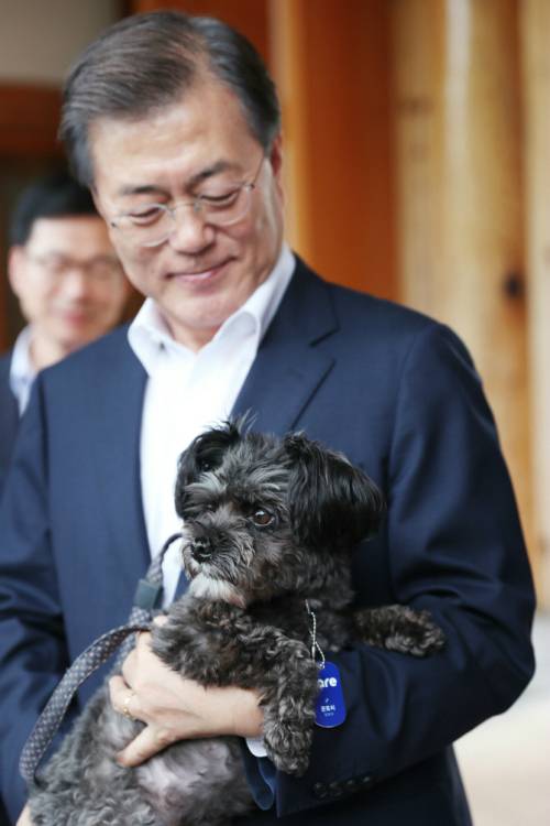 | 문재인 대통령이 지난해 7월 26일 입양한 유기견 `토리`를 안고 있다. 청와대 제공 |