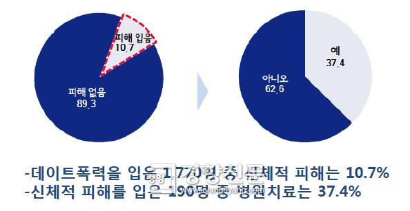 데이트폭력은 유형별(행동통제, 언어·정서·경제적폭력, 신체적폭력, 성적폭력)로 시작 시기는 다르지만 대부분 사귄 후 1년 이내에 폭력이 시작됐다고 응답했다. 대응에 있어선 ‘별다른 조치를 취하지 않았다’가 과반 이상을 차지했다. 또 데이트폭력 피해자 중 46.4%는 가해자인 상대방과 결혼했고, 이중 17.4%는 가정폭력을 당한 것으로 나타났다.
