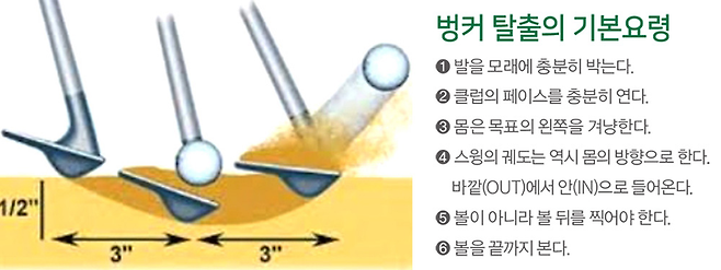 모래 위에 섰을 때 할 일은 클럽 페이스를 먼저 열어 놓는다. 볼은 오른발 쪽에 놓고 셋업 자세를 취한다. 모래를 뚫고 빠져나가기 위해서는 평소 리듬대로의 스윙이 필요하다. 다만 충분히 큰 백스윙을 만들어야 한다. 이때 클럽 헤드가 볼 뒤쪽 모래를 파고 들어가게 한다. 그런 뒤 중간에 스윙을 멈추지 말고 계속 진행해 피니시까지 완전히 몸이 돌아가도록 한다. 벙커샷의 성공비결이다.