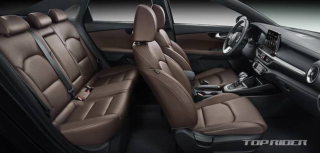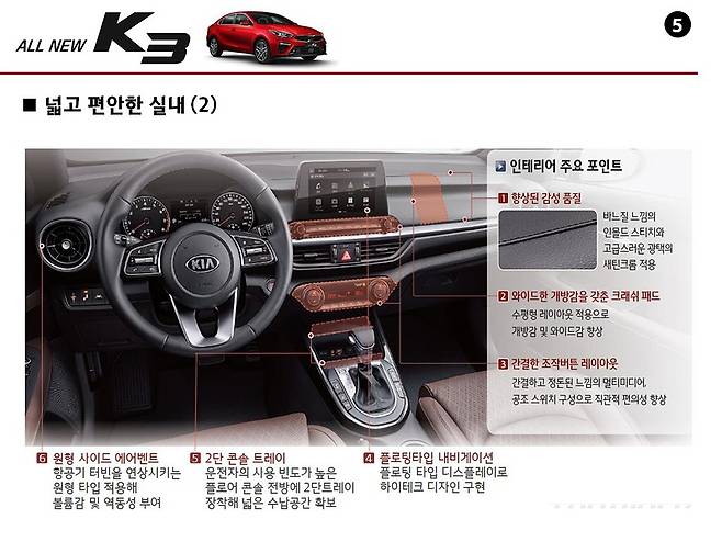 올 뉴 K3의 실내공간은 수평으로 뻗은 크롬 가니쉬를 적용한 센터페시아를 통해 와이드한 디자인을 통해 공간감을 강조했다. 또한 최신 플로팅 타입의 내비게이션을 적용하고 디테일이 강조된 원형 사이드 에어벤트를 통해 스타일리시함을 강조했다.